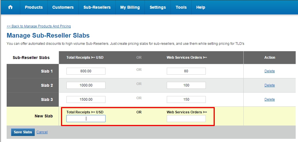 On the next page, add a New Slab based on Total Receipts or Web Services (Email Hosting + Windows Web Hosting + Linux Web Hosting + Website Builder) Orders and click on the Save Slabs button.